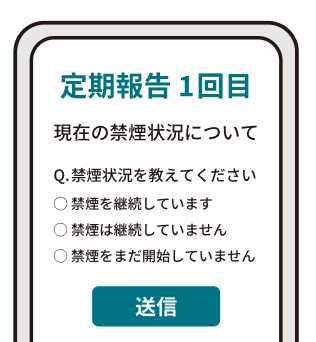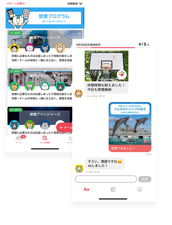 チームのメンバーみんなで禁煙頑張っているという雰囲気作りのアプリ画像投稿がとても禁煙継続に寄与しました。チャットの毎日報告は仲間意識が上がり自分もという気持ちになれました。このプログラムに参加したことで、きっぱり禁煙できてとてもよかったです。ありがとうございました。